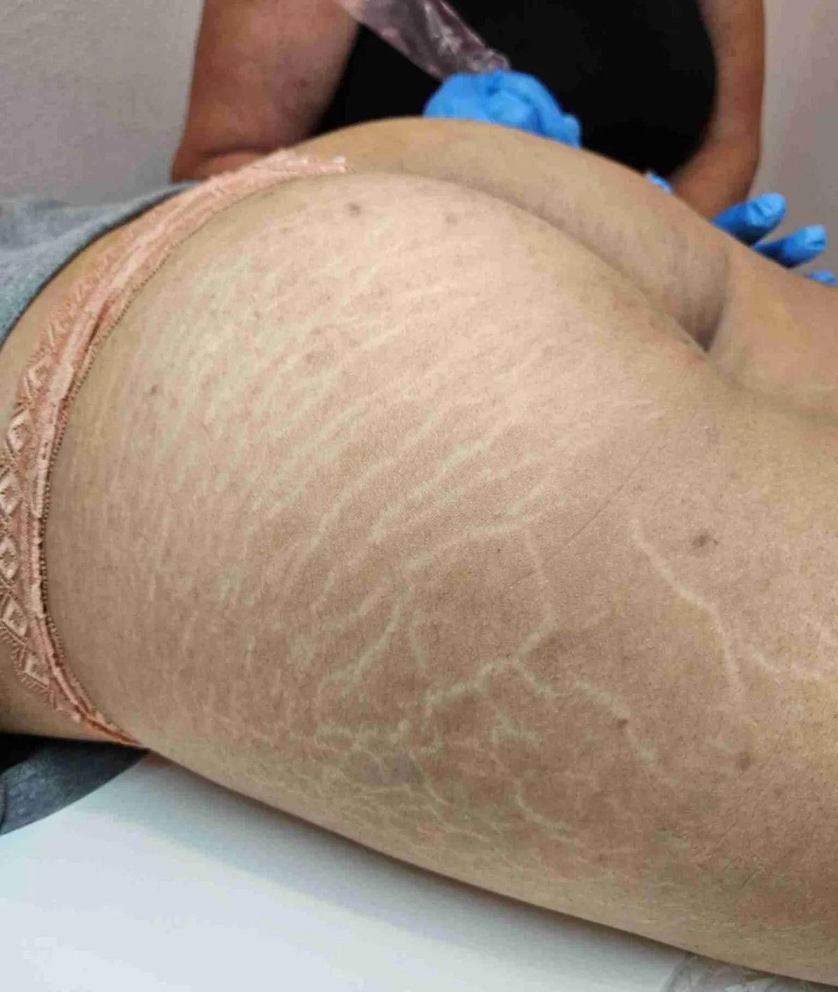 Stretch mark and scar camouflage treatment is a specialized procedure that blends pigments into the skin to reduce the appearance of stretch marks and scars. The goal is to match the pigment to your natural skin tone, creating a smoother and more uniform appearance. The treatment involves the application of medical-grade pigments into the dermal layer of the skin using advanced micropigmentation techniques. This process helps to mask the appearance of stretch marks and scars by blending them with the surrounding skin.